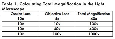 The total Magnification (M) equals the product of the ocular lens magnification (10x) and the objective lens that you are using: