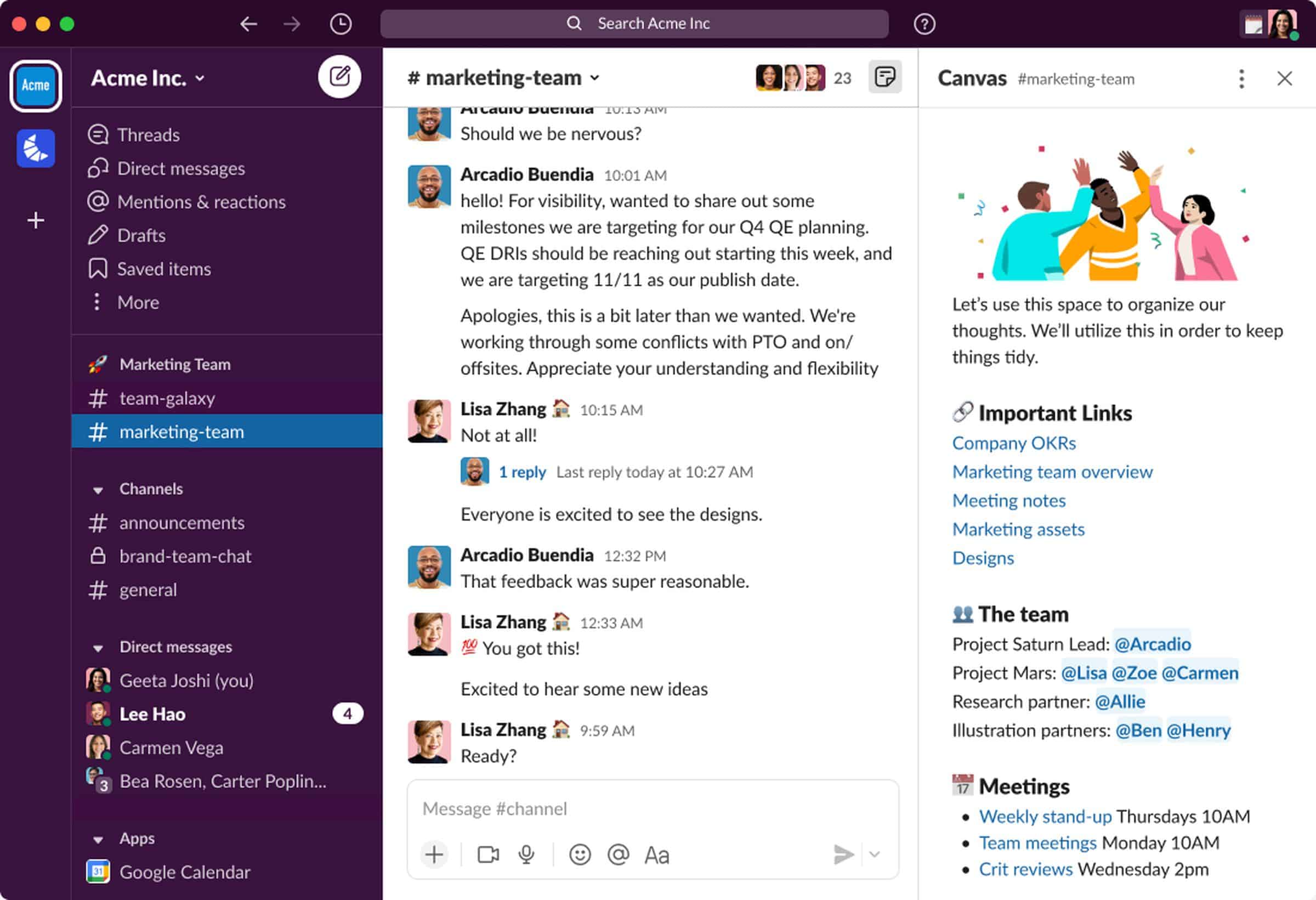 | Integrations | Integrates with apps like Google Drive, Jira, etc. | Extensive app ecosystem and bot integrations |