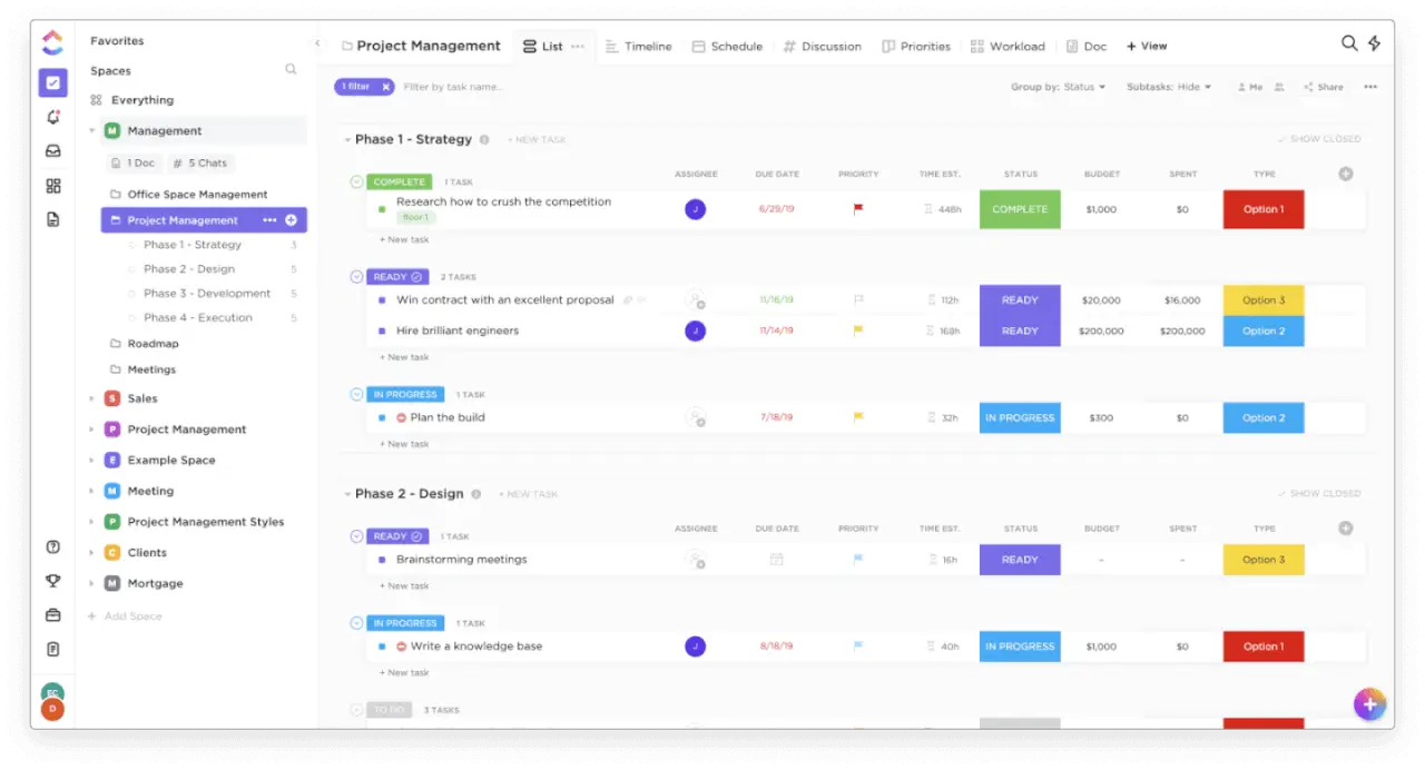 - ClickUp: A project management and productivity tool designed to manage tasks, track projects, and collaborate with team members. It’s feature-rich and includes task management, timelines, goal tracking, docs, and dashboards.