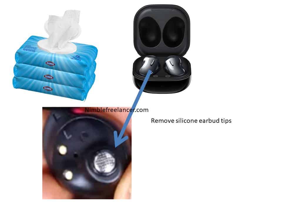 In my case, I used simple cleaning wipes like the one below. You need to remove silicone earbud tips and clean them using a wipe with alcohol: