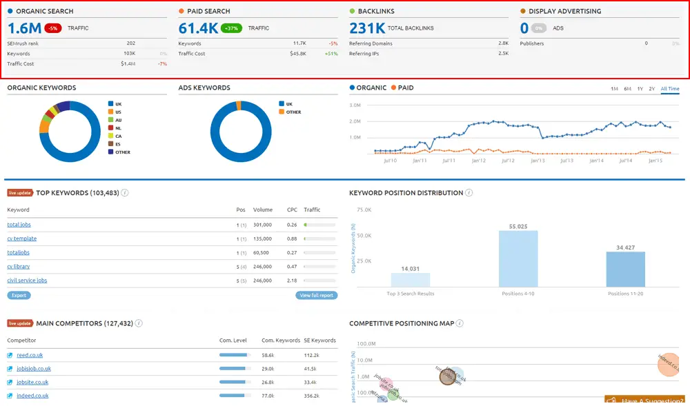 The Semrush SEO toolkit is very popular among users looking for a detailed analytical report about their competitors. The tool is highly efficient and is divided into five different sections. Using the features of this tool, you can strategize an effective marketing plan and surpass your competitors.