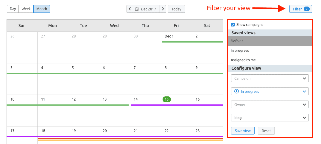 Marketing Calendar: Content Marketing is not a one-time process and does not end by just writing it. Your website content should be optimized to keep up with the changing trends. Therefore, it is essential to manage your content continuously. The Marketing Calendar helps you check the content deadlines and related tasks. It helps ensure the tasks are completed on time by notifying your team members about the status of the functions and the deadlines.