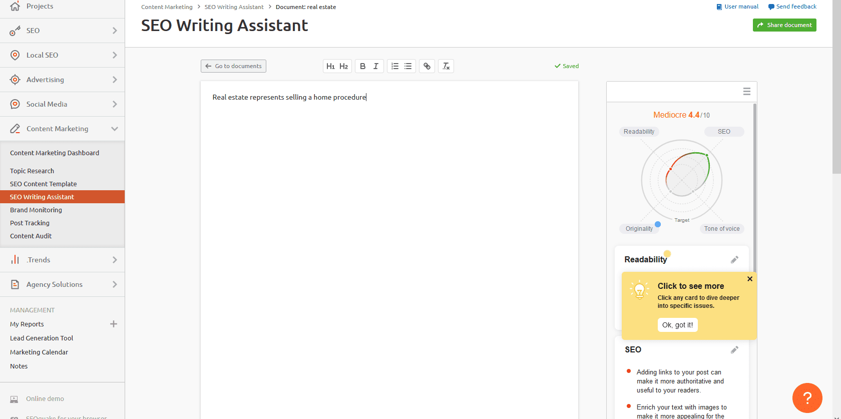 SEO Writing Assistant: Another tool in the Content Marketing Toolkit by Semrush that improves the credibility of your website content is the SEO Writing Assistant. As an assistant, it helps in many ways to create or enhance the content of your website. These improvements are made to make your content SEO-friendly. Other benefits of using this tool are that it helps maintain the tone of voice of the content, makes it plagiarism-free, and enhances its readability.
