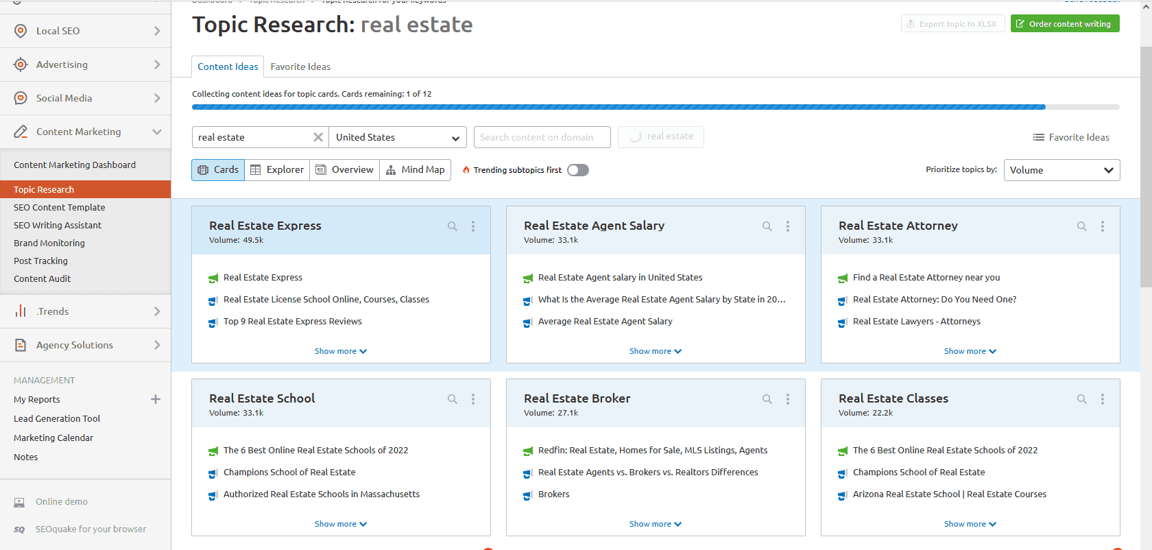 Topic Research: Before writing the main body of the content, the first step is to decide on the topic. The subject and the primary draft of the content are determined according to the target audience. With the help of Semrush Topic Research, you can find the topics, subtopics, and headings that the customers are most interested in. This can all be done within a few clicks.