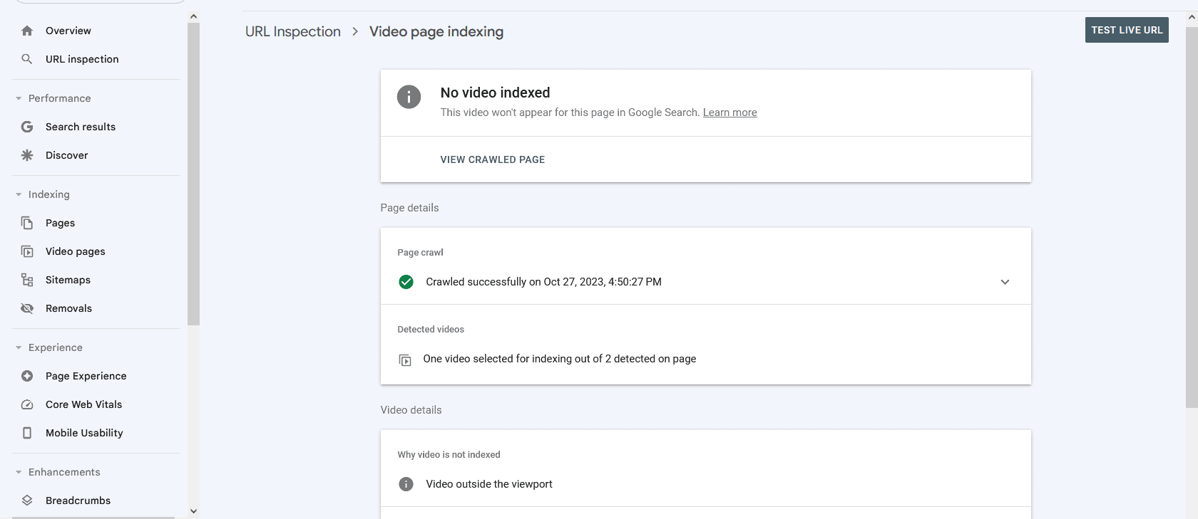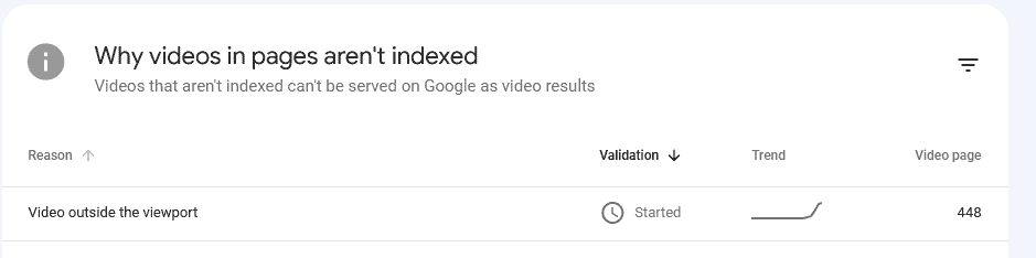 “The video must appear in the viewport when loading the page to be considered for indexing. Move the video so that the entire video is inside the renderable area of the page and seen when the page loads.
