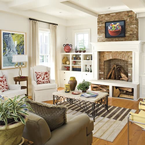 The raised hearth fireplace represents an elevated floor to accommodate the fireplace. Usually, sitting-height hearths are built off the floor, no more than 17 inches up. This is a great way to add extra seating to your hearth room.