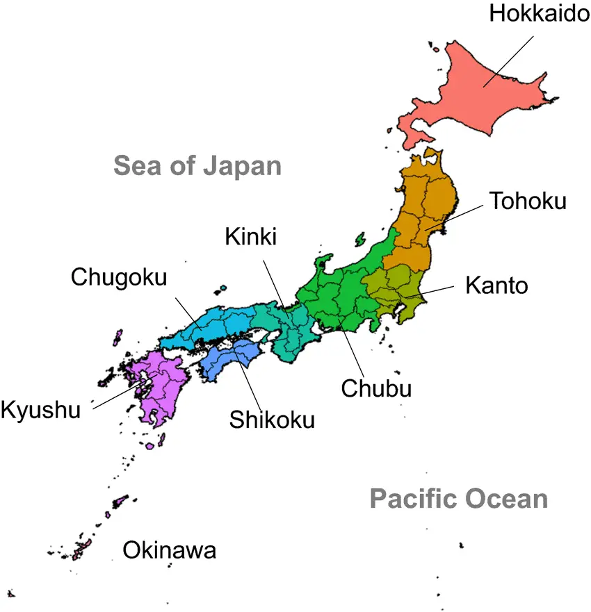 The four main islands (Hokkaido, Honshu, Kyushu, and Shikoku) are located in two main geometrical areas: Hokkaido and Western Honshu, Kyushu and Eastern Honshu. In the northern part of Japan, the latitude is 4531′ N; in the south, it is 3719′ S. The distance from Hokkaido to Tokyo is 550 km.
